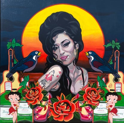 Deze unieke Amy Winehouse homage collage brengt iconische elementen uit het leven en de stijl van Amy Winehouse samen in een opvallende, kleurrijke popartstijl. Het kunstwerk combineert bijzondere kleuren met een eigen, moderne vormtaal en is een echte blikvanger in elke ruimte.