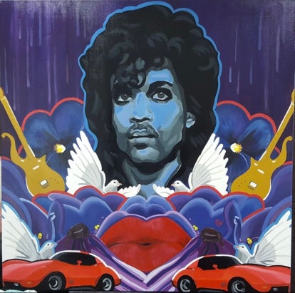 Centraal staat Prince in zijn iconische, flamboyante houding: mysterieus, zelfverzekerd en sensueel. Rondom hem zweven herkenbare elementen.