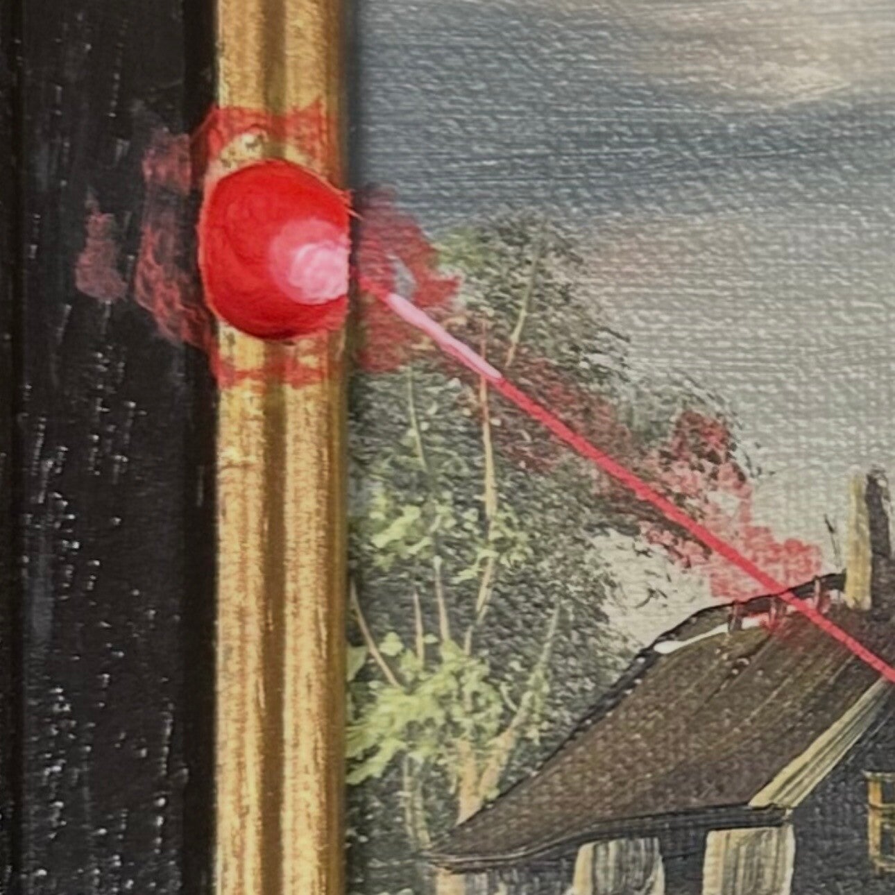 Kringloopschilderij omgetoverd tot mixed media ode: Shaun the Sheep in een nieuwe setting vol knipoog. Met een echt weggebrand gat in de lijst! Verder is dit landschapje helemaal opgefrist en met het extra vernislaagje straalt dit werk weer als nooit tevoren.