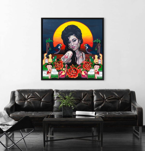 Deze unieke Amy Winehouse homage collage brengt iconische elementen uit het leven en de stijl van Amy Winehouse samen in een opvallende, kleurrijke popartstijl. Het kunstwerk combineert bijzondere kleuren met een eigen, moderne vormtaal en is een echte blikvanger in elke ruimte.
